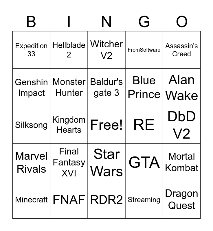 This bingo card has a free space and 25 words: Final Fantasy XVI, RDR2, Baldur's gate 3, Minecraft, Assassin's Creed, Expedition 33, Genshin Impact, Hellblade 2, RE, Star Wars, Blue Prince, Silksong, GTA, Mortal Kombat, Monster Hunter, Tomb Raider, DbD V2, Witcher V2, Alan Wake, Kingdom Hearts, Dragon Quest, FNAF, Marvel Rivals, FromSoftware and Streaming.