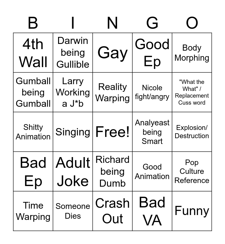 This bingo card has a free space and 24 words: Adult Joke, Someone Dies, Reality Warping, Time Warping, Body Morphing, 4th Wall, Gumball being Gumball, Darwin being Gullible, Analyeast being Smart, Richard being Dumb, Nicole fight/angry, Shitty Animation, Good Animation, Pop Culture Reference, Larry Working a J*b, Bad VA, Explosion/ Destruction, Gay, "What the What" / Replacement Cuss word, Singing, Funny, Bad Ep, Good Ep and Crash Out.