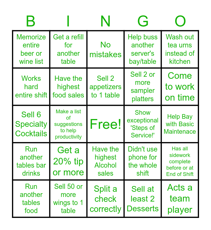 This bingo card has a free space and 24 words: Run another tables food, Get a 20% tip or more, Sell 2 appetizers to 1 table, Sell at least 2 Desserts, Wash out tea urns instead of kitchen, Memorize entire beer or wine list, Get a refill for another table, No mistakes, Show exceptional 'Steps of Service!', Help Bay with Basic Maintenace, Sell 6 Specialty Cocktails, Have the highest food sales, Didn't use phone for the whole shift, Has all sidework complete before or at End of Shift, Works hard entire shift, Sell 50 or more wings to 1 table, Split a check correctly, Help buss another server's bay/table, Come to work on time, Run another tables bar drinks, Make a list of suggestions to help productivity, Have the highest Alcohol sales, Sell 2 or more sampler platters and Acts a team player.