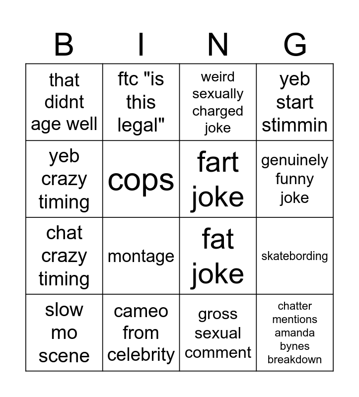This bingo card has 17 words: gross sexual comment, slow mo scene, weird sexually charged joke, that didnt age well, montage, yeb start stimmin, skatebording, fart joke, genuinely funny joke, cops, cameo from celebrity, fat joke, yeb crazy timing, ftc "is this legal", chat crazy timing, 100 gifted subs and chatter mentions amanda bynes breakdown.
