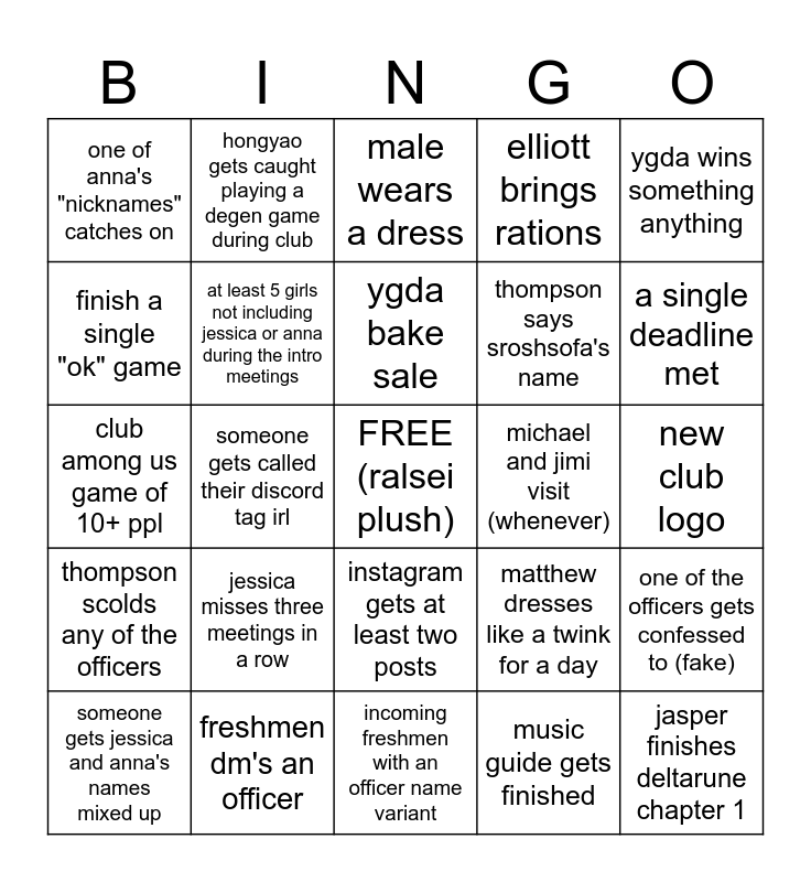 This bingo card has a free space and 24 words: jessica misses three meetings in a row, freshmen dm's an officer, ygda bake sale, someone gets jessica and anna's names mixed up, ygda wins something anything, one of anna's "nicknames" catches on, finish a single "ok" game, hongyao gets caught playing a degen game during club, michael and jimi visit (whenever), instagram gets at least two posts, thompson says sroshsofa's name, club among us game of 10+ ppl, matthew dresses like a twink for a day, one of the officers gets confessed to (fake), at least 5 girls not including jessica or anna during the intro meetings, music guide gets finished, new club logo, male wears a dress, a single deadline met, someone gets called their discord tag irl, jasper finishes deltarune chapter 1, thompson scolds any of the officers, elliott brings rations and incoming freshmen with an officer name variant.
