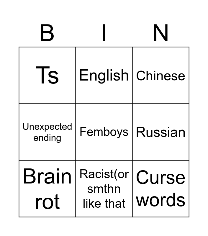 This bingo card has a free space and 8 words: Russian, Chinese, English, Brain rot, Ts, Curse words, Unexpected ending and Racist(or smthn like that.
