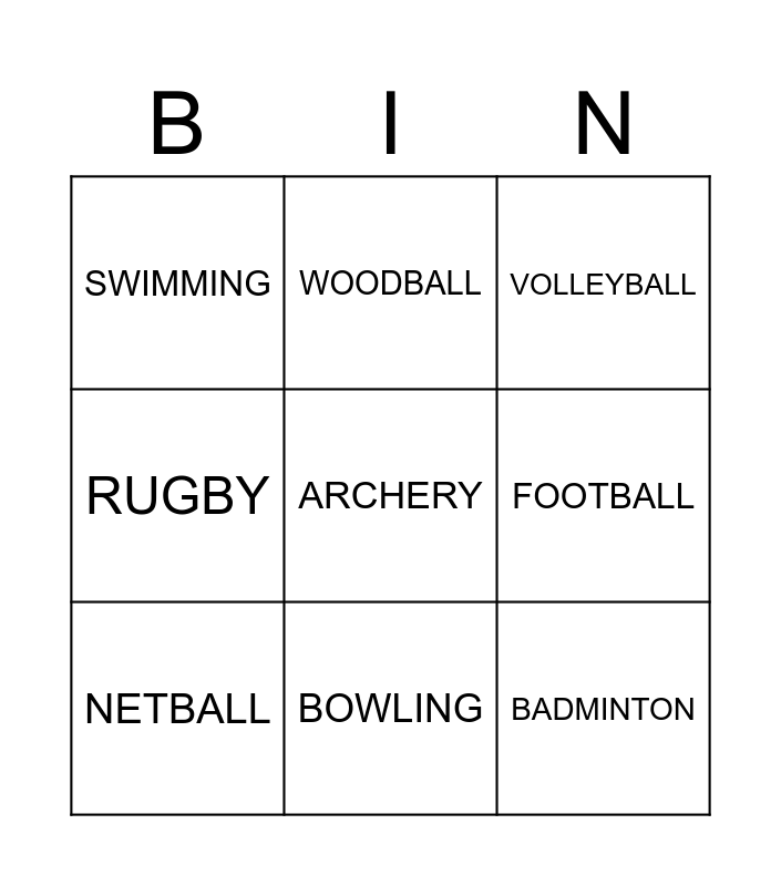 This bingo card has 12 words: TENNIS, BOWLING, BADMINTON, RUGBY, WOODBALL, FOOTBALL, NETBALL, HANDBALL, VOLLEYBALL, SWIMMING, ARCHERY and HOCKEY.