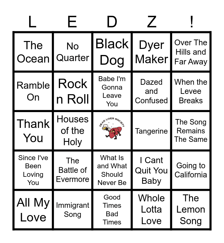This bingo card has a free space and 27 words: I Cant Quit You Baby, Communication Breakdown, Dazed and Confused, Good Times Bad Times, Ramble On, Black Dog, No Quarter, Since I've Been Loving You, Tangerine, Going to California, Thank You, Dyer Maker, All My Love, Immigrant Song, When the Levee Breaks, Whole Lotta Love, Rock n Roll, Babe I'm Gonna Leave You, The Battle of Evermore, The Ocean, The Song Remains The Same, Whole Lotta Love, Houses of the Holy, The Lemon Song, What Is and What Should Never Be, Over The Hills and Far Away and HeartBreaker.