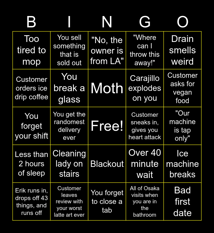 This bingo card has a free space and 24 words: Cleaning lady on stairs, Customer leaves review with your worst latte art ever, Moth, Erik runs in, drops off 43 things, and runs off, Drain smells weird, Too tired to mop, Customer orders ice drip coffee, You sell something that is sold out, Customer sneaks in, gives you heart attack, Blackout, Carajillo explodes on you, You forget your shift, Over 40 minute wait, Ice machine breaks, You break a glass, All of Osaka visits when you are in the bathroom, "Our machine is tap only", "No, the owner is from LA", Customer asks for vegan food, You get the randomest delivery ever, Bad first date, Less than 2 hours of sleep, "Where can I throw this away!" and You forget to close a tab.
