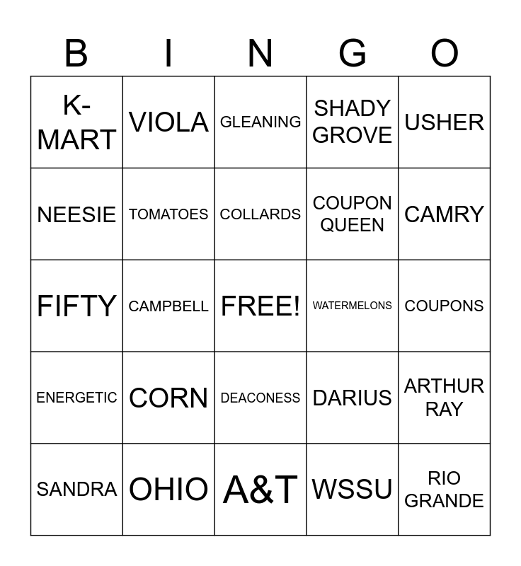 This bingo card has a free space and 29 words: SANDRA, SIMS, CAMPBELL, REG. OF DEEDS, K-MART, GLEANING, TOMATOES, CORN, WATERMELONS, OHIO, COUPONS, RIO GRANDE, A&T, WSSU, CAMRY, KITCHEN MINISTRY, DEACONESS, ENERGETIC, USHER, FIFTY, DARIUS, JR., COUPON QUEEN, NEESIE, SHADY GROVE, VIOLA, ARTHUR RAY, COLLARDS and GREENS.