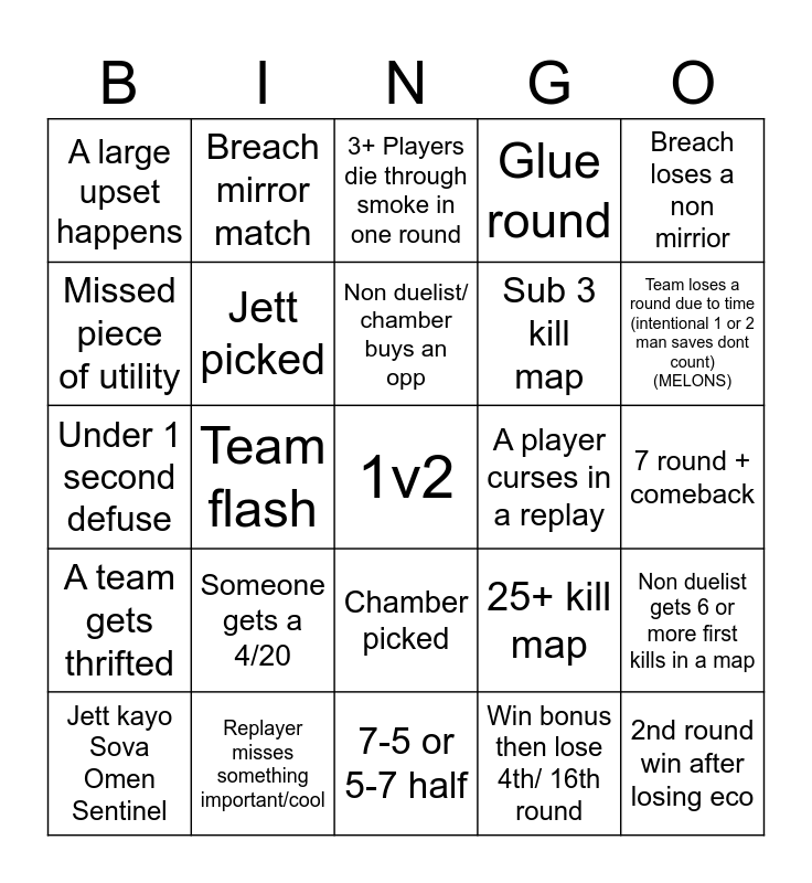 This bingo card has 68 words: Ace, 1v2, 1v3, 1v4, Insane Flick, Whiff, Breach mirror match, Glue round, Non duelist/ chamber buys an opp, Bad corrode comp, Chamber picked, Odin 3k+, 7 round + comeback, Breach loses a non mirrior, Someone off roles (ie. Derrek chamber), Missed piece of utility, Team flash, A large upset happens, Pie, Someone gets a 4/20, Sub 3 kill map, 25+ kill map, A team gets thrifted, 2nd round win after losing eco, Bonus conversion, Map score reaches 7-1 or 1-7, Double Senti played, Single digit headshot % (either map or series), Non duelist gets 6 or more first kills in a map, IGL has a pop off round, 3+ Players die through smoke in one round, Double duelist played, Double Controller played, Double inti played, Glue round, A Shotgun gets 2+ kills, A team forces 2nd round and wins, Jett kayo Sova Omen Sentinel, Team loses a round due to time (intentional 1 or 2 man saves dont count) (MELONS), Under 1 second defuse, No duelist comp, No senti comp, Jett picked, One of Pheonix, Reyna, Harbor, Clove or Tejo picked, Bind played, Ability Kill (Headhunter, Jett ult, chamber ult, and neon ult dont count), A team first bans corrode, A player does a silly emote, A player curses in a replay, Replayer misses something important/cool, PRIUS (bad observing round), 5+ Ults used in a round by both teams combined, Ascent played, 7-5 or 5-7 half, 9-3 or 3-9 half, Player has sub 3 kills at half time, Win bonus then lose 4th/ 16th round, A player massively underperforming that map has a pop off round, Someone doesnt ult for 4+ rounds, Team uses both timeouts in one half, A team wins 13-3, 13-2, 13-1 or 13-0, OT, Running/sliding rifle kill, Iso, Gekko, or Sage picked, 2+ Sheriffs bought on pistol round, Outlaw gets 3+ kills, Someone buys a frenzy and Cool lineup.