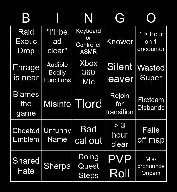 This bingo card has a free space and 24 words: Unfunny Name, Sherpa, Xbox 360 Mic, Shared Fate, 1 > Hour on 1 encounter, Raid Exotic Drop, Enrage is near, "I'll be ad clear", Rejoin for transition, Bad callout, Silent leaver, Blames the game, > 3 hour clear, Falls off map, Audible Bodily Functions, PVP Roll, Fireteam Disbands, Keyboard or Controller ASMR, Wasted Super, Misinfo, Mis-pronounce Onpam, Cheated Emblem, Knower and Doing Quest Steps.