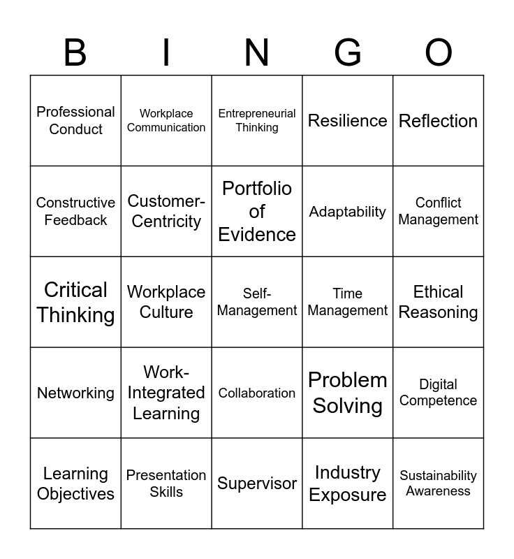 This bingo card has 25 words: Work-Integrated Learning, Supervisor, Portfolio of Evidence, Learning Objectives, Reflection, Professional Conduct, Constructive Feedback, Workplace Communication, Time Management, Collaboration, Adaptability, Critical Thinking, Problem Solving, Digital Competence, Customer-Centricity, Sustainability Awareness, Ethical Reasoning, Entrepreneurial Thinking, Conflict Management, Workplace Culture, Self-Management, Presentation Skills, Networking, Resilience and Industry Exposure.