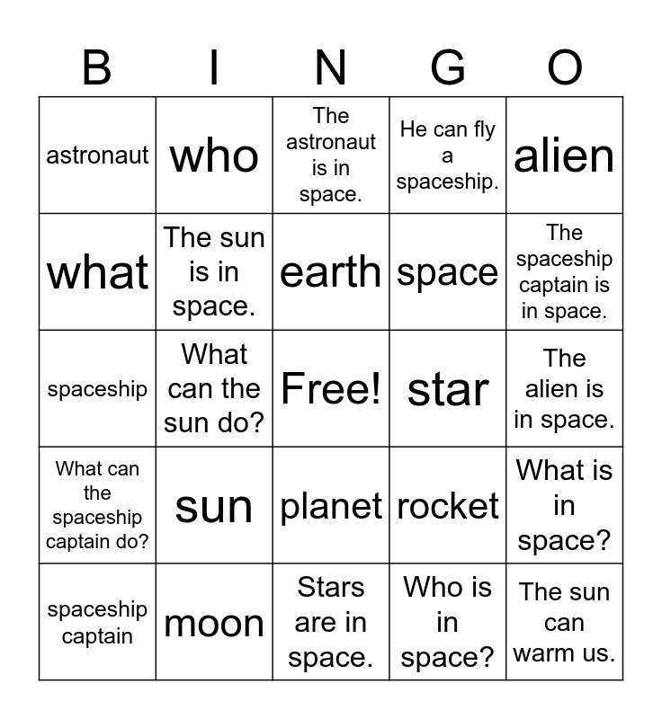 This bingo card has a free space and 24 words: sun, moon, earth, spaceship captain, alien, astronaut, what, who, star, planet, space, spaceship, rocket, What is in space?, The sun is in space., Who is in space?, The alien is in space., The astronaut is in space., The spaceship captain is in space., What can the sun do?, The sun can warm us., What can the spaceship captain do?, He can fly a spaceship. and Stars are in space..