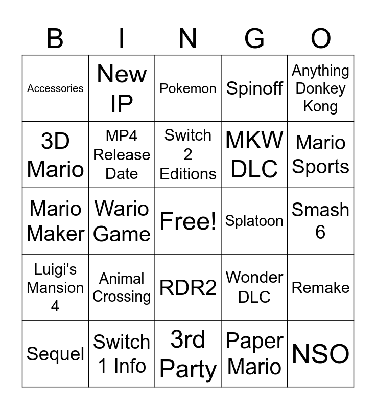 This bingo card has a free space and 24 words: Animal Crossing, Switch 1 Info, Switch 2 Editions, Sequel, Anything Donkey Kong, Accessories, 3D Mario, New IP, Splatoon, RDR2, MKW DLC, Mario Maker, Wonder DLC, Remake, MP4 Release Date, Paper Mario, Smash 6, Pokemon, Mario Sports, Wario Game, NSO, Luigi's Mansion 4, Spinoff and 3rd Party.
