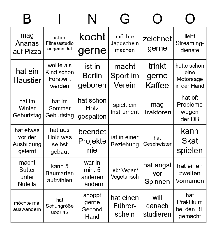 This bingo card has 36 words: lebt Vegan/ Vegetarisch, war in min. 5 anderen Ländern, hat einen Führer-schein, hat ein Haustier, hat etwas vor der Ausbildung gelernt, spielt ein Instrument, wollte als Kind schon Forstwirt werden, shoppt gerne Second Hand, zeichnet gerne, hat angst vor Spinnen, hatte schon eine Motorsäge in der Hand, möchte Jagdschein machen, hat einen zweiten Vornamen, hat im Sommer Geburtstag, macht Sport im Verein, mag Ananas auf Pizza, macht Butter unter Nutella, mag Traktoren, hat im Winter Geburtstag, kocht gerne, hat schon Holz gespalten, hat aus Holz was selbst gebaut, ist in einer Beziehung, beendet Projekte nie, hat Geschwister, ist im Fitnessstudio angemeldet, trinkt gerne Kaffee, hat Schuhgröße über 42, ist in Berlin geboren, liebt Streaming-dienste, hat Praktikum bei den BF gemacht, möchte mal auswandern, kann Skat spielen, hat oft Probleme wegen der DB, kann 5 Baumarten aufzählen and will danach studieren.