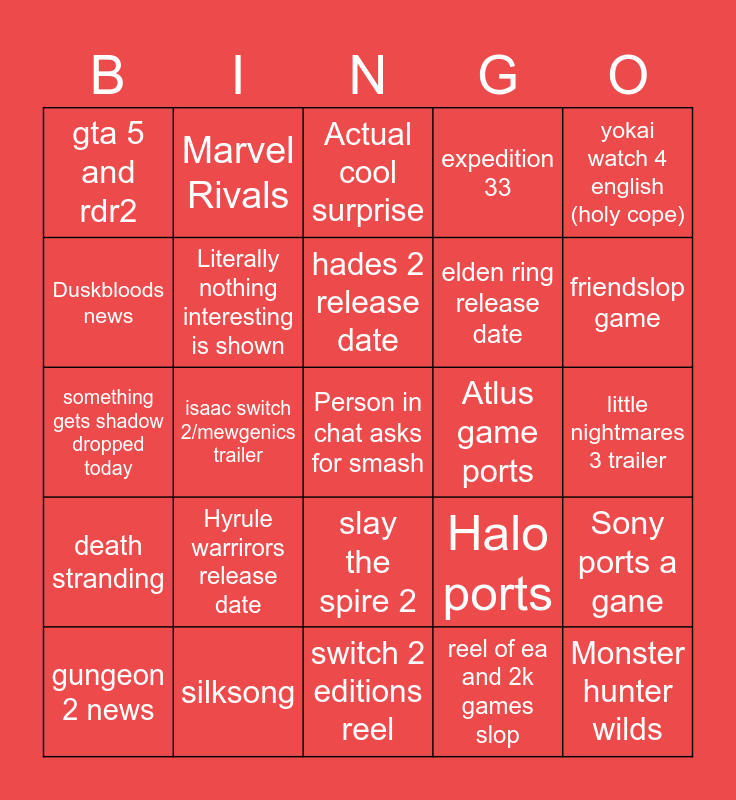 This bingo card has a free space and 24 words: Hyrule warrirors release date, silksong, hades 2 release date, gungeon 2 news, yokai watch 4 english (holy cope), gta 5 and rdr2, Duskbloods news, Marvel Rivals, Atlus game ports, slay the spire 2, elden ring release date, something gets shadow dropped today, Halo ports, Sony ports a gane, Literally nothing interesting is shown, reel of ea and 2k games slop, little nightmares 3 trailer, Actual cool surprise, friendslop game, isaac switch 2/mewgenics trailer, Monster hunter wilds, death stranding, expedition 33 and switch 2 editions reel.