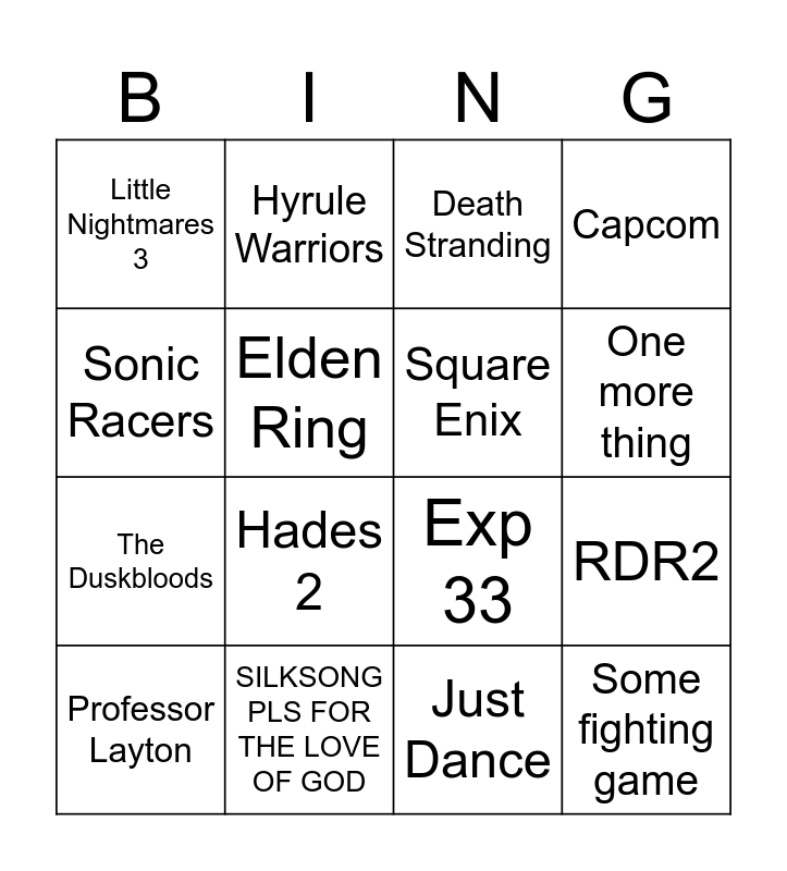 This bingo card has 16 words: SILKSONG PLS FOR THE LOVE OF GOD, RDR2, Death Stranding, Little Nightmares 3, The Duskbloods, Hyrule Warriors, Exp 33, Just Dance, Sonic Racers, Elden Ring, Professor Layton, Capcom, Hades 2, One more thing, Square Enix and Some fighting game.