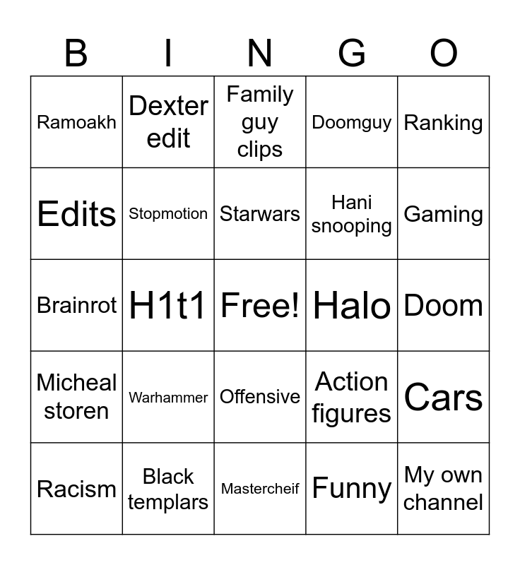 This bingo card has a free space and 24 words: Racism, Warhammer, Starwars, Funny, Ranking, Ramoakh, Dexter edit, Family guy clips, Halo, Doom, Brainrot, Stopmotion, Action figures, Cars, Edits, Black templars, Mastercheif, Doomguy, Gaming, Micheal storen, H1t1, Offensive, Hani snooping and My own channel.