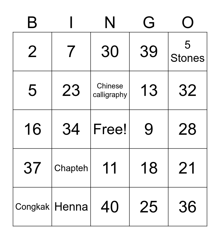 This bingo card has a free space and 24 words: Chapteh, Henna, Chinese calligraphy, Congkak, 5 Stones, 2, 5, 7, 9, 11, 13, 16, 18, 21, 23, 25, 28, 30, 32, 34, 36, 37, 39 and 40.