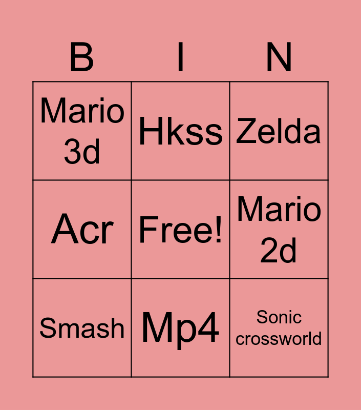 This bingo card has a free space and 8 words: Mario 2d, Zelda, Hkss, Smash, Mario 3d, Sonic crossworld, Acr and Mp4.