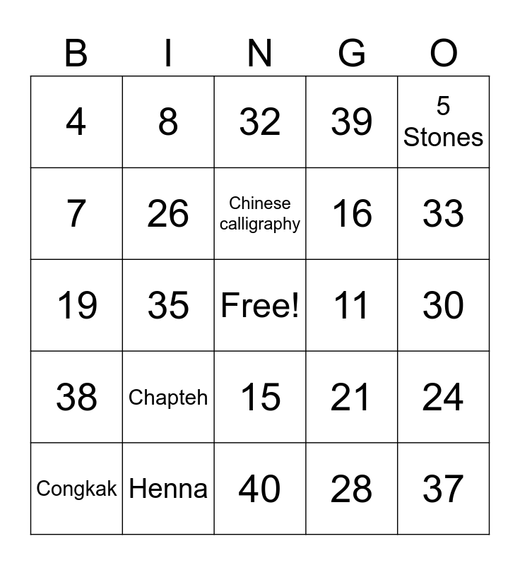 This bingo card has a free space and 24 words: Chapteh, Henna, Chinese calligraphy, Congkak, 5 Stones, 4, 7, 8, 11, 15, 16, 19, 21, 24, 26, 28, 30, 32, 33, 35, 37, 38, 39 and 40.