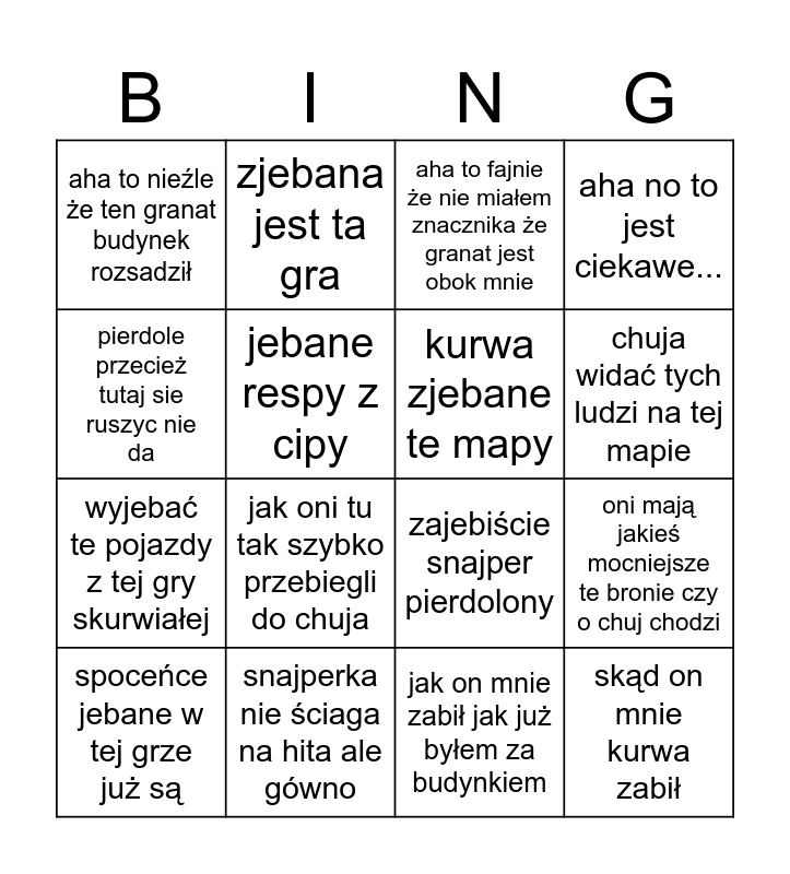 This bingo card has 16 words: snajperka nie ściaga na hita ale gówno, oni mają jakieś mocniejsze te bronie czy o chuj chodzi, aha to fajnie że nie miałem znacznika że granat jest obok mnie, aha to nieźle że ten granat budynek rozsadził, wyjebać te pojazdy z tej gry skurwiałej, zjebana jest ta gra, zajebiście snajper pierdolony, jak on mnie zabił jak już byłem za budynkiem, pierdole przecież tutaj sie ruszyc nie da, jebane respy z cipy, spoceńce jebane w tej grze już są, aha no to jest ciekawe..., jak oni tu tak szybko przebiegli do chuja, chuja widać tych ludzi na tej mapie, kurwa zjebane te mapy and skąd on mnie kurwa zabił.