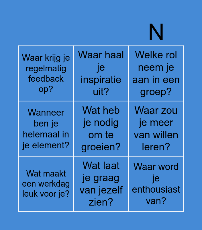 This bingo card has 9 words: Wat maakt een werkdag leuk voor je?, Welke rol neem je aan in een groep?, Waar haal je inspiratie uit?, Wanneer ben je helemaal in je element?, Waar krijg je regelmatig feedback op?, Waar zou je meer van willen leren?, Wat heb je nodig om te groeien?, Waar word je enthousiast van? and Wat laat je graag van jezelf zien?.