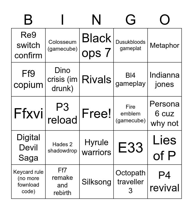 This bingo card has a free space and 24 words: Hades 2 shadowdrop, Ff7 remake and rebirth, Rivals, Keycard rule (no more fownload code), Metaphor, Re9 switch confirm, Ff9 copium, Colosseum (gamecube), Fire emblem (gamecube), Hyrule warriors, Bl4 gameplay, Ffxvi, E33, Lies of P, Dino crisis (im drunk), Octopath traveller 3, Persona 6 cuz why not, Black ops 7, Indianna jones, P3 reload, P4 revival, Digital Devil Saga, Dusukbloods gameplat and Silksong.