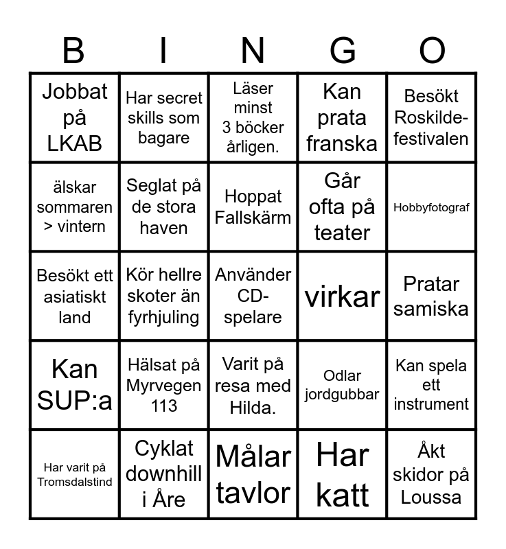 This bingo card has a free space and 59 words: Klättrare, Cyklat downhill i Åre, Har Phd, Kan SUP:a, Har katt, Bor i sthlm, Seglat på de stora haven, Varit på skidor med Hilda, Går ofta på teater, Bestigit Kebnekaise, Kan prata franska, Älskar Vaffel med brunost, älskar sommaren > vintern, Sprungit Göteborgsvarvet >10 gånger, Är hungrig, Jobbat på LKAB, Åkt skidor på Loussa, Besökt Roskilde-festivalen, Jobbar på UNN, Hoppat Fallskärm, virkar, Läser minst 3 böcker årligen., Har varit på Tromsdalstind, Kan spela ett instrument, Sjuksköterska, Har hund, Underhåller en surdeg, Är pensionär, Hobbyfotograf, Tycker bubbel smakar samma, Kan texten "Bara bada bastu", Cyklat vätternrundan, Bor i Tromsø, Badat från Bergan i Lyngen, Har secret skills som bagare, Sett hela The white lotus, Är konstnär, Kör hellre skoter än fyrhjuling, Syr fina grejer, Besökt ett asiatiskt land, Gått lyngentrappan, Hälsat på Myrvegen 113, Pratar samiska, Gillar surströmmning, Åkt skidor från Verdens ende, Lärare, Varit med i Nordlys, Kan rida på häst, Varit på resa med Hilda., Målar tavlor, Varit på Hellström-konsert, Längtar till vintern., Gillar att sova i tält, Kan dansa tango, Varit på Svalbard, Odlar jordgubbar, Kan hjula, Sjukgymnast and Har aldrig varit så långt norrut.