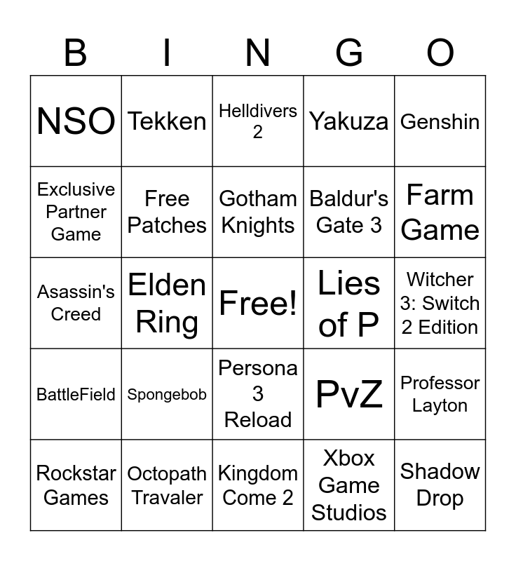 This bingo card has a free space and 24 words: Spongebob, Octopath Travaler, Gotham Knights, Rockstar Games, Genshin, NSO, Exclusive Partner Game, Tekken, Lies of P, Persona 3 Reload, Baldur's Gate 3, Asassin's Creed, PvZ, Professor Layton, Free Patches, Xbox Game Studios, Witcher 3: Switch 2 Edition, Helldivers 2, Farm Game, Elden Ring, Shadow Drop, BattleField, Yakuza and Kingdom Come 2.