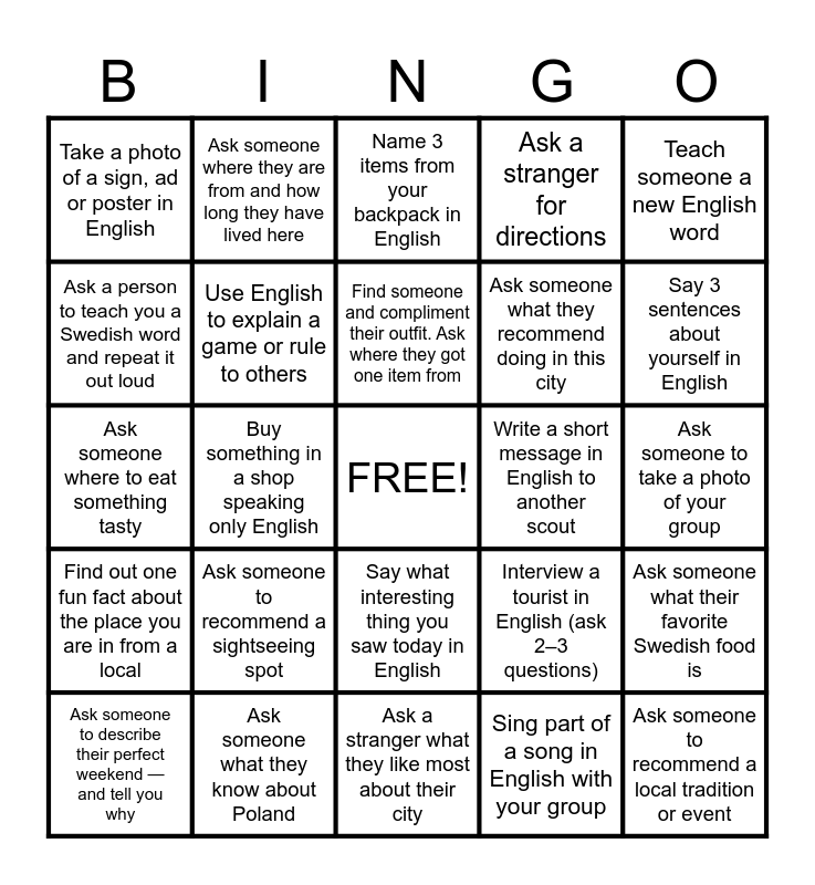 This bingo card has a free space and 24 words: Ask someone to recommend a sightseeing spot, Ask someone what they know about Poland, Find someone and compliment their outfit. Ask where they got one item from, Ask someone to describe their perfect weekend — and tell you why, Teach someone a new English word, Take a photo of a sign, ad or poster in English, Ask a person to teach you a Swedish word and repeat it out loud, Ask someone where they are from and how long they have lived here, Write a short message in English to another scout, Say what interesting thing you saw today in English, Ask someone what they recommend doing in this city, Ask someone where to eat something tasty, Interview a tourist in English (ask 2–3 questions), Ask someone what their favorite Swedish food is, Use English to explain a game or rule to others, Sing part of a song in English with your group, Ask someone to take a photo of your group, Name 3 items from your backpack in English, Say 3 sentences about yourself in English, Buy something in a shop speaking only English, Ask someone to recommend a local tradition or event, Find out one fun fact about the place you are in from a local, Ask a stranger for directions and Ask a stranger what they like most about their city.