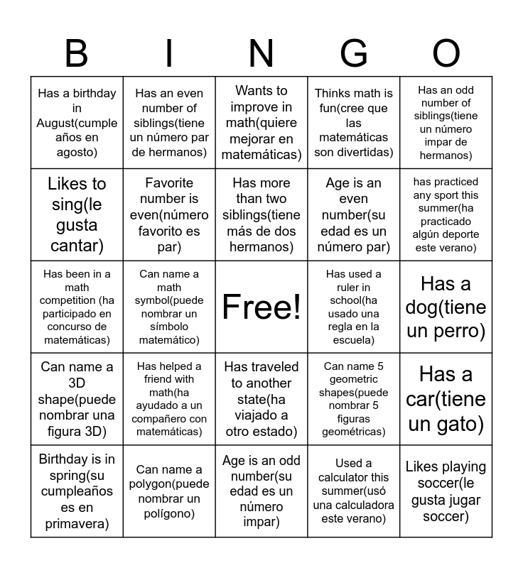 This bingo card has a free space and 24 words: Has helped a friend with math(ha ayudado a un compañero con matemáticas), Can name a polygon(puede nombrar un polígono), Has more than two siblings(tiene más de dos hermanos), Birthday is in spring(su cumpleaños es en primavera), Has an odd number of siblings(tiene un número impar de hermanos), Has a birthday in August(cumple años en agosto), Likes to sing(le gusta cantar), Has an even number of siblings(tiene un número par de hermanos), Has used a ruler in school(ha usado una regla en la escuela), Has traveled to another state(ha viajado a otro estado), Age is an even number(su edad es un número par), Has been in a math competition (ha participado en concurso de matemáticas), Can name 5 geometric shapes(puede nombrar 5 figuras geométricas), Has a car(tiene un gato), Favorite number is even(número favorito es par), Used a calculator this summer(usó una calculadora este verano), Has a dog(tiene un perro), Wants to improve in math(quiere mejorar en matemáticas), has practiced any sport this summer(ha practicado algún deporte este verano), Can name a math symbol(puede nombrar un símbolo matemático), Likes playing soccer(le gusta jugar soccer), Can name a 3D shape(puede nombrar una figura 3D), Thinks math is fun(cree que las matemáticas son divertidas) and Age is an odd number(su edad es un número impar).