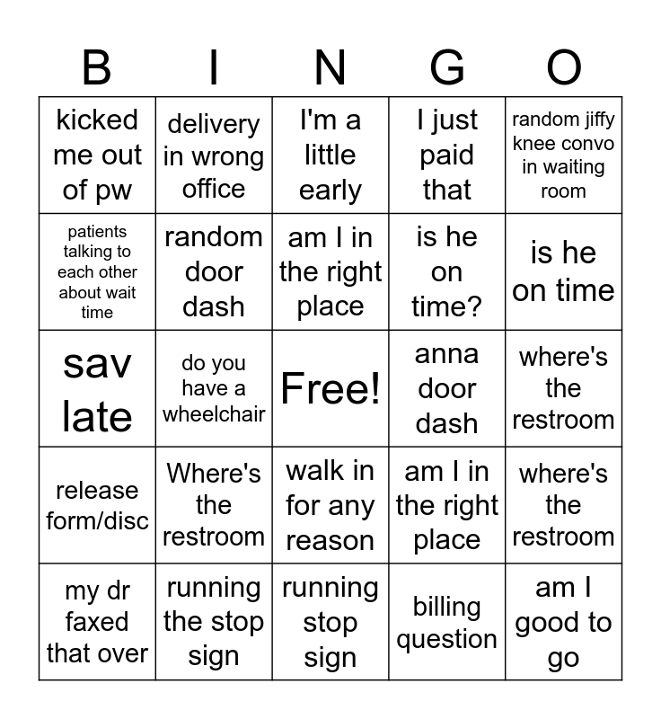 This bingo card has a free space and 24 words: Where's the restroom, running the stop sign, am I in the right place, my dr faxed that over, random jiffy knee convo in waiting room, kicked me out of pw, patients talking to each other about wait time, delivery in wrong office, anna door dash, walk in for any reason, is he on time?, sav late, am I in the right place, where's the restroom, random door dash, billing question, where's the restroom, I'm a little early, is he on time, do you have a wheelchair, am I good to go, release form/disc, I just paid that and running stop sign.