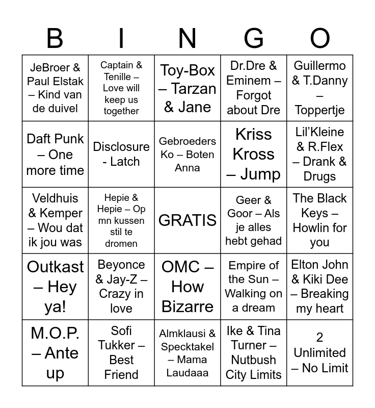 This bingo card has a free space and 48 words: 2 Brothers on the 4th Floor – Never alone, 2 Unlimited – No Limit, Acda & De Munnik – Regent zonnestralen, Almklausi & Specktakel – Mama Laudaaa, Beyonce & Jay-Z – Crazy in love, C.Lownoise & Mental T. – Hardcore Feelings, Captain & Tenille – Love will keep us together, Chemical Brothers – Galvenize, Daft Punk – One more time, Diggy Dex & Eva de Rovere – Slaap zacht, Disclosure - Latch, Dr.Dre & Eminem – Forgot about Dre, Elton John & Kiki Dee – Breaking my heart, Empire of the Sun – Walking on a dream, Eurythmics – Sweet dreams, G.Meeuwis & Vagant – Het is een nacht, Gebroeders Ko – Boten Anna, Geer & Goor – Als je alles hebt gehad, Gerst & Lamme Frans – Alles in een, Guillermo & T.Danny – Toppertje, Hepie & Hepie – Op mn kussen stil te dromen, Ike & Tina Turner – Nutbush City Limits, JeBroer & Paul Elstak – Kind van de duivel, Kriss Kross – Jump, Lange Frans & Baas B – Diemen Zuid, Lil’Kleine & R.Flex – Drank & Drugs, M.O.P. – Ante up, Nick & Simon – Rosanne, OMC – How Bizarre, Outkast – Hey ya!, Right Said Fred – I’m too sexy, S10 & Froukje – Nooit meer spijt, Safri Duo – Played-A-Live, Salt-n-Pepa – Push it, Sofi Tukker – Best Friend, Sonny & Cher – I got you babe, Suzan & Freek – Goud, The Black Keys – Howlin for you, The Everly Brothers – Bye bye love, The Opposites – Sjonnie & Anita, The Proclaimers – I’m gonna be (500 miles), The White Stripes – Seven Nation Army, Toy-Box – Tarzan & Jane, Travolta & Olivia NJ – The one that I want, Veldhuis & Kemper – Wou dat ik jou was, Wham! – Wake me up before you GoGo, Young Dylan & Jantje – Bonus and Zware Jongens – De Kneu.