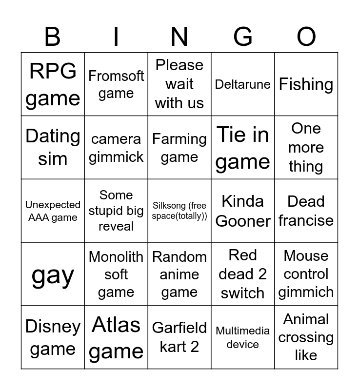 This bingo card has a free space and 24 words: Monolith soft game, Atlas game, Farming game, Disney game, Fishing, RPG game, Dating sim, Fromsoft game, Kinda Gooner, Random anime game, Tie in game, Unexpected AAA game, Red dead 2 switch, Mouse control gimmich, camera gimmick, Multimedia device, Dead francise, Please wait with us, One more thing, Some stupid big reveal, Animal crossing like, gay, Deltarune and Garfield kart 2.