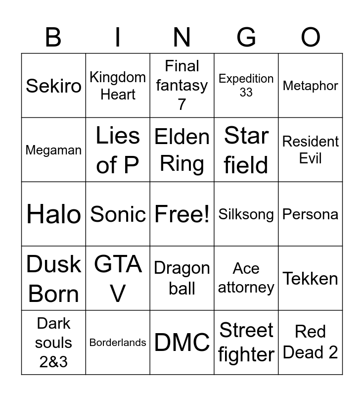 This bingo card has a free space and 24 words: GTA V, Borderlands, Elden Ring, Dark souls 2&3, Metaphor, Sekiro, Megaman, Kingdom Heart, Silksong, Dragon ball, Star field, Halo, Ace attorney, Tekken, Lies of P, Street fighter, Persona, Final fantasy 7, Resident Evil, Sonic, Red Dead 2, Dusk Born, Expedition 33 and DMC.