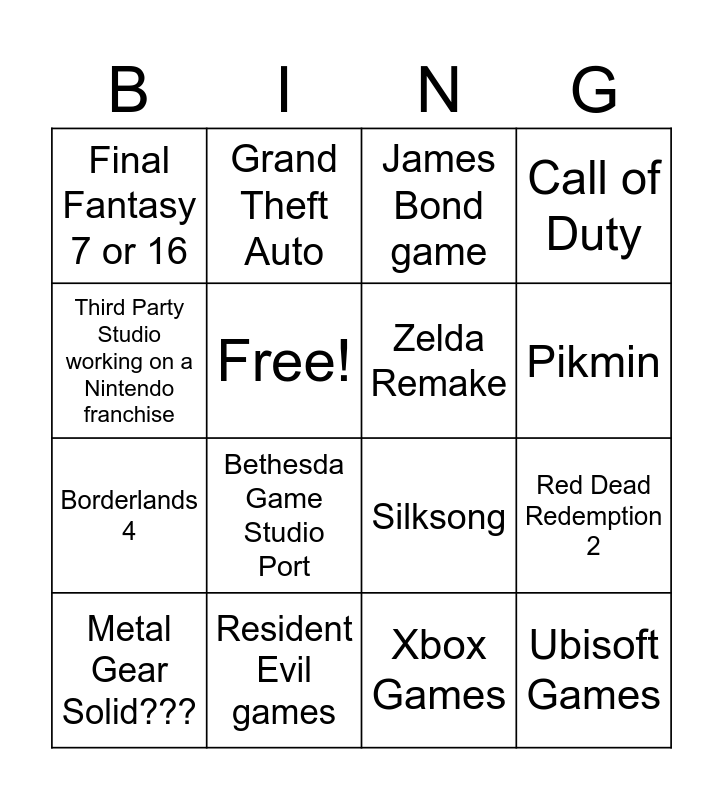 This bingo card has 16 words: Resident Evil games, Red Dead Redemption 2, James Bond game, Final Fantasy 7 or 16, Borderlands 4, Grand Theft Auto, Silksong, Xbox Games, Third Party Studio working on a Nintendo franchise, Free!, Metal Gear Solid???, Call of Duty, Bethesda Game Studio Port, Pikmin, Zelda Remake and Ubisoft Games.