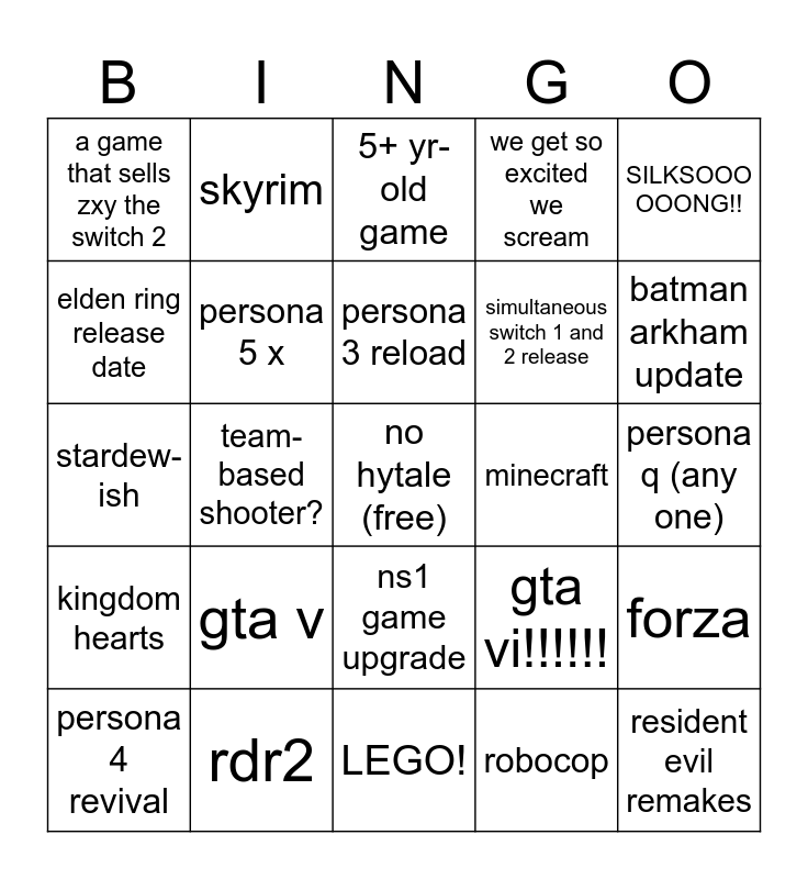This bingo card has a free space and 24 words: gta v, rdr2, persona 3 reload, persona 4 revival, SILKSOOO OOONG!!, a game that sells zxy the switch 2, elden ring release date, skyrim, minecraft, ns1 game upgrade, simultaneous switch 1 and 2 release, stardew-ish, gta vi!!!!!!, forza, persona 5 x, robocop, persona q (any one), 5+ yr-old game, batman arkham update, team-based shooter?, resident evil remakes, kingdom hearts, we get so excited we scream and LEGO!.