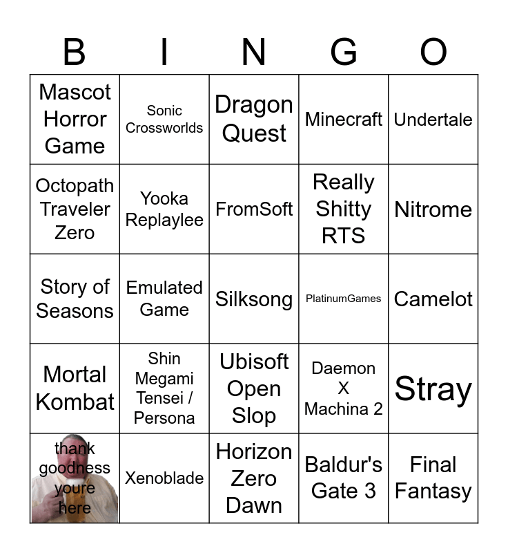 This bingo card has 1 images, a free space and 24 words: Shin Megami Tensei / Persona, Xenoblade, FromSoft, thank goodness youre here, Undertale, Mascot Horror Game, Octopath Traveler Zero, Sonic Crossworlds, PlatinumGames, Ubisoft Open Slop, Really Shitty RTS, Story of Seasons, Daemon X Machina 2, Stray, Yooka Replaylee, Baldur's Gate 3, Camelot, Dragon Quest, Nitrome, Emulated Game, Final Fantasy, Mortal Kombat, Minecraft and Horizon Zero Dawn.