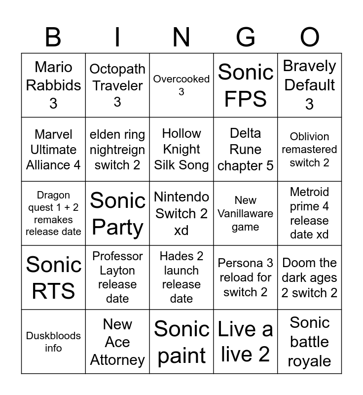 This bingo card has a free space and 24 words: Professor Layton release date, New Ace Attorney, Hollow Knight Silk Song, Duskbloods info, Bravely Default 3, Mario Rabbids 3, Marvel Ultimate Alliance 4, Octopath Traveler 3, New Vanillaware game, Hades 2 launch release date, Delta Rune chapter 5, Dragon quest 1 + 2 remakes release date, Persona 3 reload for switch 2, Doom the dark ages 2 switch 2, elden ring nightreign switch 2, Live a live 2, Metroid prime 4 release date xd, Overcooked 3, Oblivion remastered switch 2, Sonic Party, Sonic battle royale, Sonic RTS, Sonic FPS and Sonic paint.