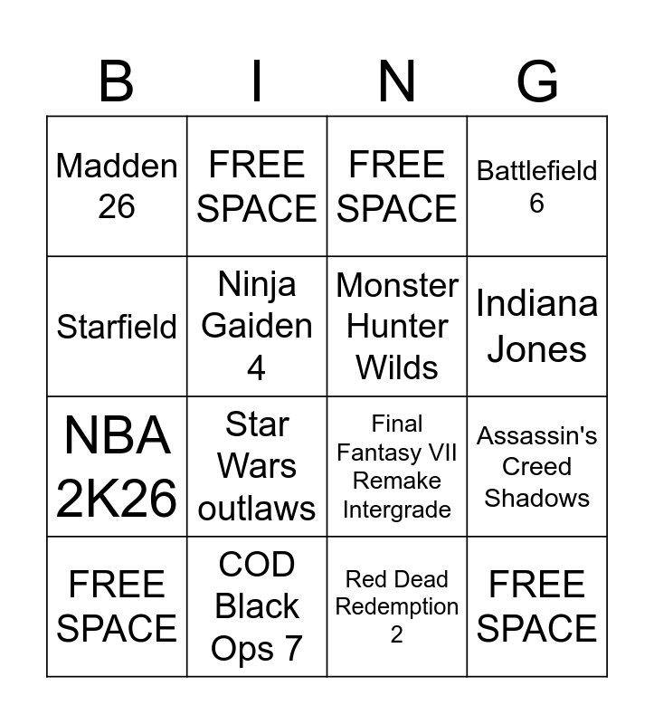 This bingo card has 16 words: COD Black Ops 7, Assassin's Creed Shadows, FREE SPACE, Madden 26, NBA 2K26, FREE SPACE, Final Fantasy VII Remake Intergrade, Red Dead Redemption 2, Starfield, Ninja Gaiden 4, FREE SPACE, Battlefield 6, Star Wars outlaws, Indiana Jones, Monster Hunter Wilds and FREE SPACE.