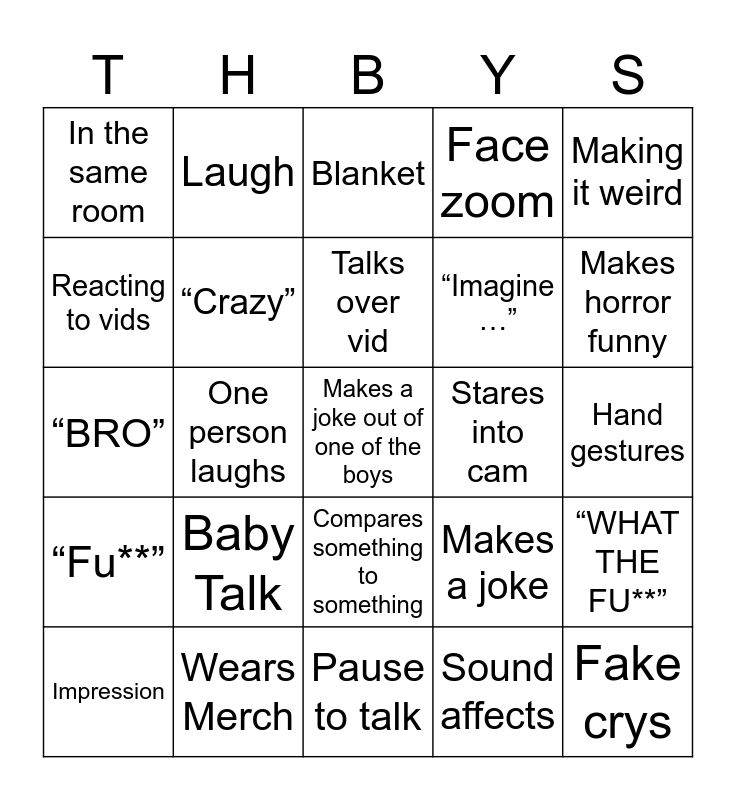 This bingo card has 25 words: Baby Talk, Pause to talk, Talks over vid, Impression, Making it weird, In the same room, Reacting to vids, Laugh, Stares into cam, Compares something to something, “Imagine …”, “BRO”, Makes a joke, “WHAT THE FU**”, “Crazy”, Fake crys, Hand gestures, Blanket, Makes horror funny, One person laughs, Makes a joke out of one of the boys, Wears Merch, “Fu**”, Face zoom and Sound affects.