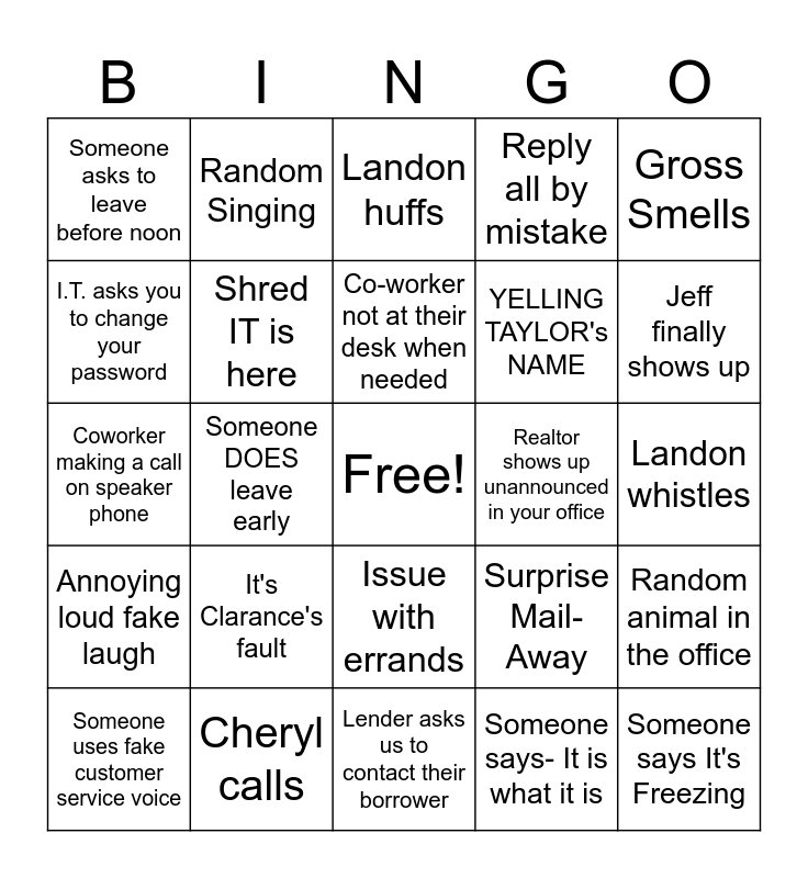 This bingo card has a free space and 35 words: Someone shows up late, Someone disappears across the street, Missing person in a closing, Shred IT is here, Issue with errands, Reply all by mistake, I.T. asks you to change your password, Someone mentions drinking, Co-worker not at their desk when needed, Getting a call that isn't for you, Coworker making a call on speaker phone, Gross Smells, yawning-Loudly!, someone makes excuse to not show up to GORA event, Someone asks to leave before noon, Realtor shows up unannounced in your office, Someone says- It is what it is, Someone DOES leave early, Annoying loud fake laugh, Someone says It's Freezing, Surprise Mail-Away, Someone uses fake customer service voice, Random animal in the office, Cheryl calls, Landon huffs, Jeff finally shows up, Surprise Closing- TODAY, YELLING JENNIFER's NAME, YELLING TAYLOR's NAME, Landon whistles, Have to short a file, Lender asks us to contact their borrower, It's Clarance's fault, Random Singing and Mouse Sneeze.