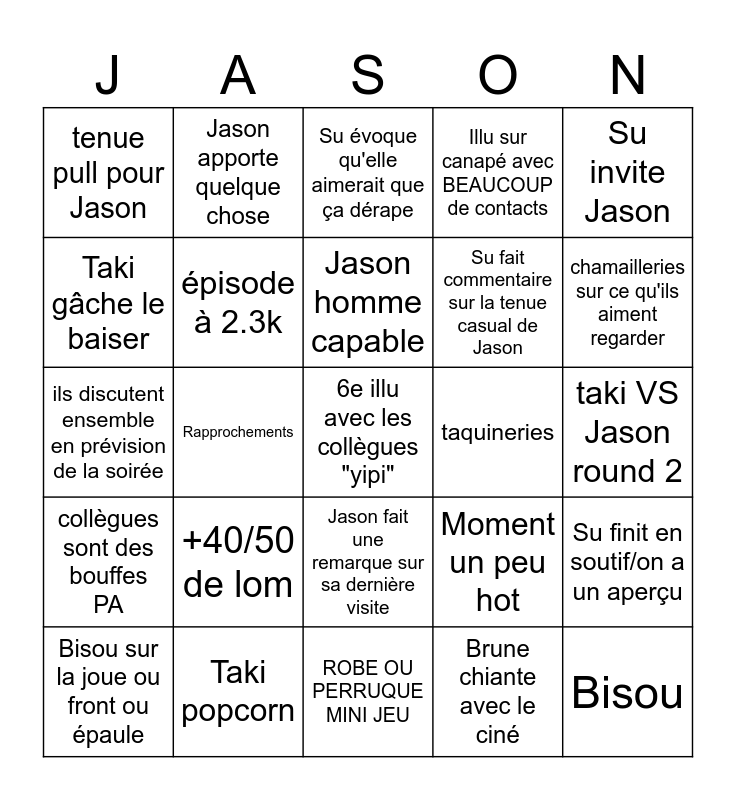 This bingo card has a free space and 24 words: +40/50 de lom, Taki popcorn, Jason homme capable, Bisou sur la joue ou front ou épaule, Su invite Jason, tenue pull pour Jason, Taki gâche le baiser, Jason apporte quelque chose, taquineries, Jason fait une remarque sur sa dernière visite, Su fait commentaire sur la tenue casual de Jason, ils discutent ensemble en prévision de la soirée, Moment un peu hot, Su finit en soutif/on a un aperçu, épisode à 2.3k, Brune chiante avec le ciné, taki VS Jason round 2, Su évoque qu'elle aimerait que ça dérape, chamailleries sur ce qu'ils aiment regarder, Rapprochements, Bisou, collègues sont des bouffes PA, Illu sur canapé avec BEAUCOUP de contacts and ROBE OU PERRUQUE MINI JEU.