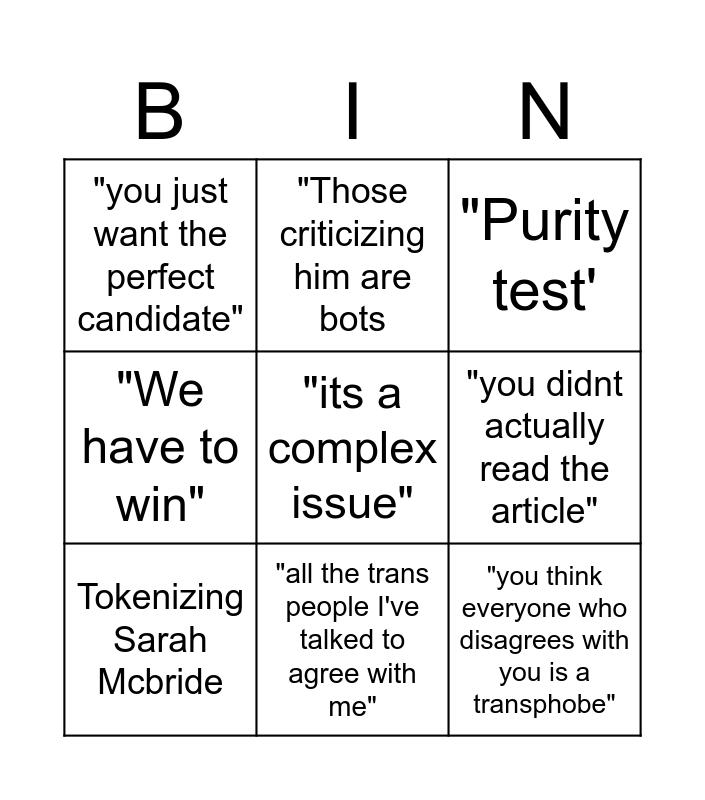 This bingo card has a free space and 8 words: "you didnt actually read the article", "Purity test', "Those criticizing him are bots, Tokenizing Sarah Mcbride, "you just want the perfect candidate", "you think everyone who disagrees with you is a transphobe", "We have to win" and "all the trans people I've talked to agree with me".