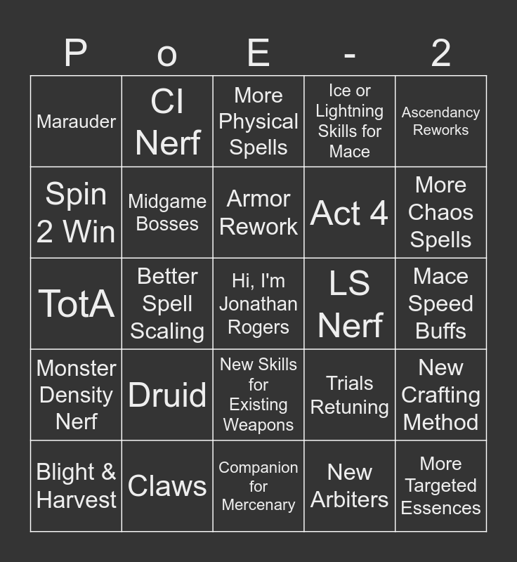 This bingo card has a free space and 24 words: Druid, Claws, Armor Rework, Blight & Harvest, Ascendancy Reworks, Marauder, Spin 2 Win, CI Nerf, LS Nerf, New Skills for Existing Weapons, Act 4, TotA, Trials Retuning, New Crafting Method, Midgame Bosses, New Arbiters, Mace Speed Buffs, More Physical Spells, More Chaos Spells, Better Spell Scaling, More Targeted Essences, Monster Density Nerf, Ice or Lightning Skills for Mace and Companion for Mercenary.