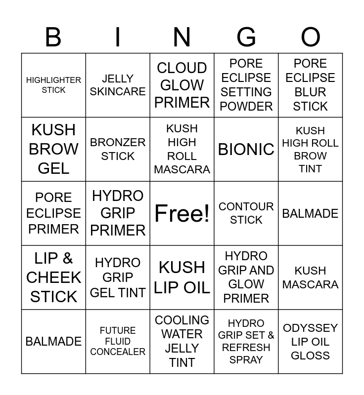 This bingo card has a free space and 24 words: HYDRO GRIP GEL TINT, FUTURE FLUID CONCEALER, KUSH HIGH ROLL MASCARA, BALMADE, PORE ECLIPSE BLUR STICK, HIGHLIGHTER STICK, KUSH BROW GEL, JELLY SKINCARE, CONTOUR STICK, KUSH LIP OIL, BIONIC, PORE ECLIPSE PRIMER, HYDRO GRIP AND GLOW PRIMER, KUSH MASCARA, BRONZER STICK, HYDRO GRIP SET & REFRESH SPRAY, BALMADE, CLOUD GLOW PRIMER, KUSH HIGH ROLL BROW TINT, HYDRO GRIP PRIMER, ODYSSEY LIP OIL GLOSS, LIP & CHEEK STICK, PORE ECLIPSE SETTING POWDER and COOLING WATER JELLY TINT.