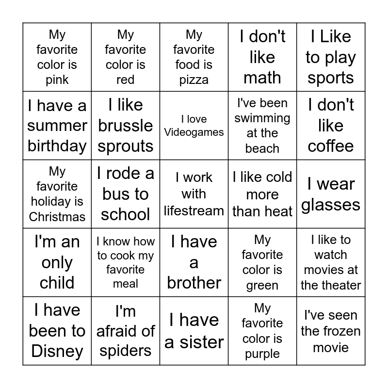 This bingo card has a free space and 29 words: I have been to Disney, I'm missing a tooth, I rode a bus to school, I have brown hair, My favorite color is pink, My favorite food is pizza, I like brussle sprouts, I know how to cook my favorite meal, I like cold more than heat, I'm afraid of spiders, I wear glasses, I've seen the frozen movie, I have a sister, My favorite color is purple, I don't like coffee, I have a pet dog, I have a brother, I'm an only child, I Like to play sports, My favorite holiday is Christmas, My favorite color is green, I have red hair, I've been swimming at the beach, I have a summer birthday, I don't like math, My favorite color is red, I like to watch movies at the theater, I love Videogames and I can name 25 states.