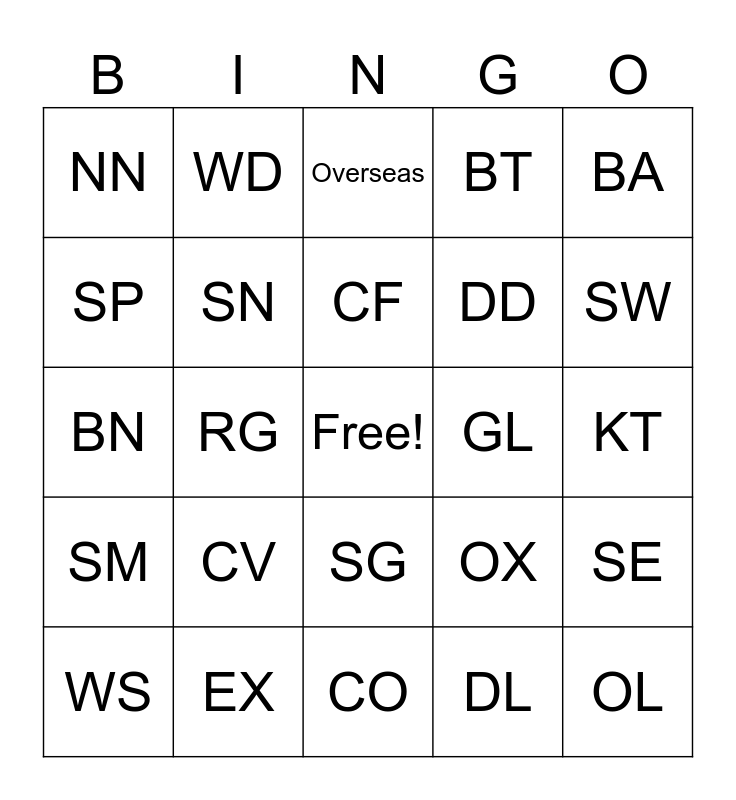 This bingo card has a free space and 24 words: CV, EX, CF, WS, BA, NN, SP, WD, GL, SG, DD, BN, OX, SE, SN, DL, KT, Overseas, SW, RG, OL, SM, BT and CO.