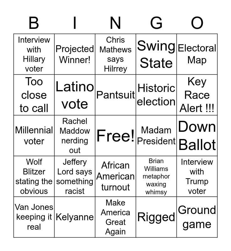This bingo card has a free space and 24 words: Jeffery Lord says something racist, Kelyanne, Pantsuit, Van Jones keeping it real, Electoral Map, Interview with Hillary voter, Too close to call, Projected Winner!, Madam President, African American turnout, Historic election, Millennial voter, Brian Williams metaphor waxing whimsy, Interview with Trump voter, Latino vote, Rigged, Down Ballot, Chris Mathews says Hilrrey, Key Race Alert !!!, Rachel Maddow nerding out, Ground game, Wolf Blitzer stating the obvious, Swing State and Make America Great Again.