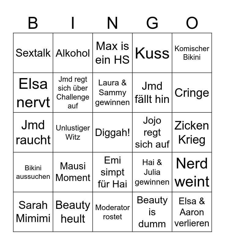 This bingo card has a free space and 24 words: Mausi Moment, Beauty heult, Laura & Sammy gewinnen, Sarah Mimimi, Komischer Bikini, Sextalk, Elsa nervt, Alkohol, Jojo regt sich auf, Emi simpt für Hai, Jmd fällt hin, Jmd raucht, Hai & Julia gewinnen, Nerd weint, Jmd regt sich über Challenge auf, Beauty is dumm, Zicken Krieg, Max is ein HS, Cringe, Unlustiger Witz, Elsa & Aaron verlieren, Bikini aussuchen, Kuss and Moderator rostet.