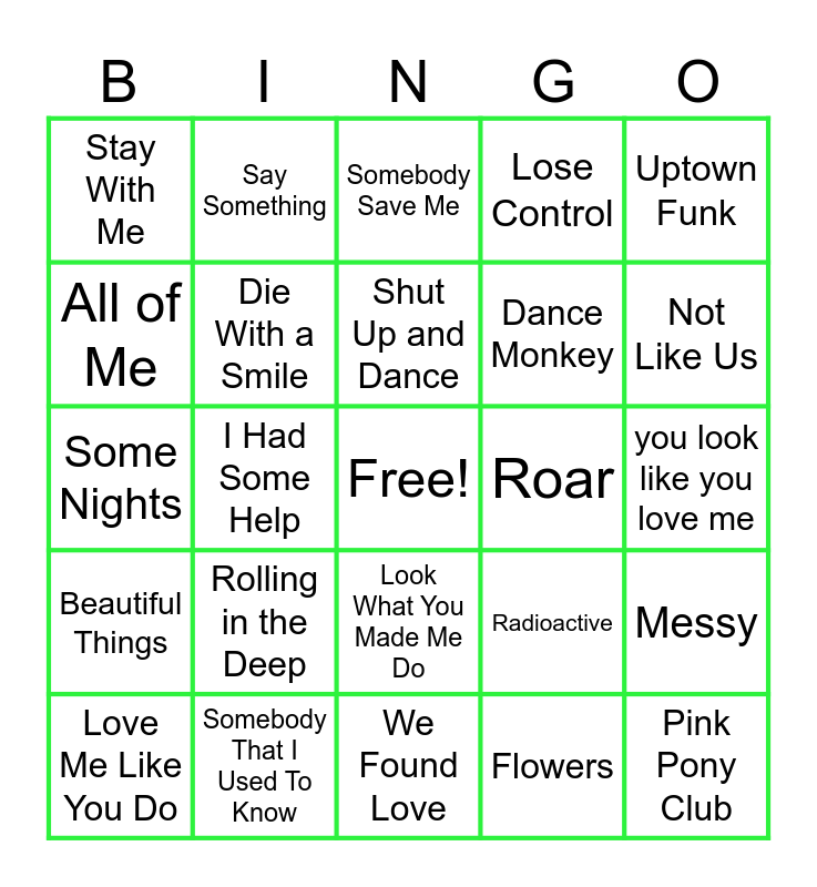 This bingo card has a free space and 24 words: Rolling in the Deep, Somebody That I Used To Know, Shut Up and Dance, Love Me Like You Do, Uptown Funk, Stay With Me, All of Me, Say Something, Roar, Look What You Made Me Do, Dance Monkey, Some Nights, Radioactive, Messy, Die With a Smile, Flowers, you look like you love me, Somebody Save Me, Not Like Us, I Had Some Help, Pink Pony Club, Beautiful Things, Lose Control and We Found Love.