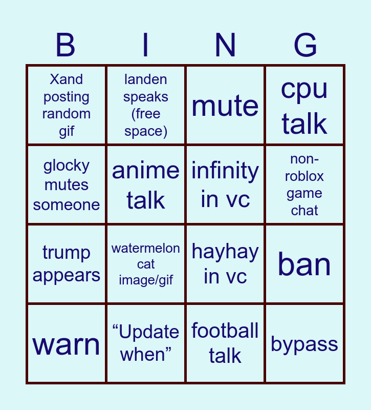This bingo card has 16 words: “Update when”, ban, mute, Xand posting random gif, trump appears, landen speaks (free space), hayhay in vc, football talk, glocky mutes someone, anime talk, warn, cpu talk, watermelon cat image/gif, non-roblox game chat, infinity in vc and bypass.